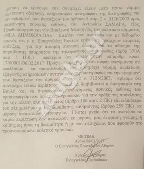 Όπως χαρακτηριστικά αναφέρεται, μετά την αρχειοθέτηση της υπόθεσης, διαπιστώνεται αρχικά ότι «υπάρχουν επαρκείς ενδείξεις για την άσκηση ποινικής δίωξης για το αδίκημα της παραβίασης απορρήτου της τηλεφωνικής επικοινωνίας», που έγινε από άγνωστο εις βάρος του πρώην πρωθυπουργού. Δηλαδή θα διερευνηθεί και θα αποδοθούν ευθύνες σε όποιον υπέκλεψε και εν συνεχεία δημοσίευσε το συγκεκριμένο ηχητικό ντοκουμέντο.