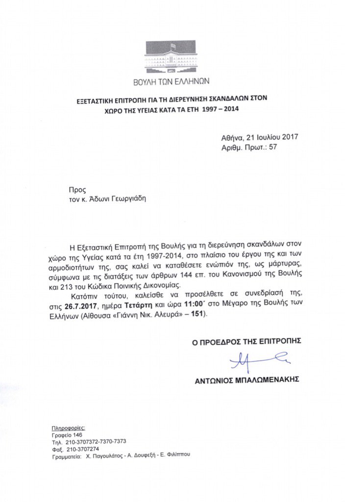 Στην Εξεταστική Επιτροπή για την διερεύνηση σκανδάλων στο χώρο της Υγείας, κατά τα έτη 1997 – 2014, κλήθηκε να καταθέσει ο Αντιπρόεδρος και Τομεάρχης Άμυνας της Νέας Δημοκρατίας, Βουλευτής Β’ Αθηνών, Άδωνις Γεωργιάδης, την Τετάρτη 26 Ιουλίου 2017, στις 11:00 π.μ.