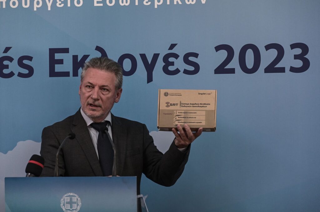 Γιατί σε όλα τα εκλογικά τμήματα πλέον οι δικαστικοί αντιπρόσωποι θα είναι εφοδιασμένοι με την ηλεκτρονική συσκευή ασφαλούς μετάδοσης SRT, οπότε σε πραγματικό χρόνο θα έρχονται εδώ τα αποτελέσματα και θα μπαίνουν στην βάση δεδομένων του υπουργείου Εσωτερικών. Συνολικά σε 21.400 εκλογικά τμήματα θα υπάρχει αυτή η συσκευή ασφαλούς μετάδοσης στην οποία ο δικαστικός αντιπρόσωπος θα περνά τα αποτελέσματα. Παράλληλα τα αποτελέσματα θα αναμεταδίδονται και με την κλασική μέθοδο, δηλαδή με τα κλασικά τηλεγραφήματα. Αυτό ίσχυε από το 1981 από τους δήμους δηλαδή και τις περιφέρειες θα φτάνουν εδώ και θα μπαίνουν στη βάση του Υπουργείου Εσωτερικών.