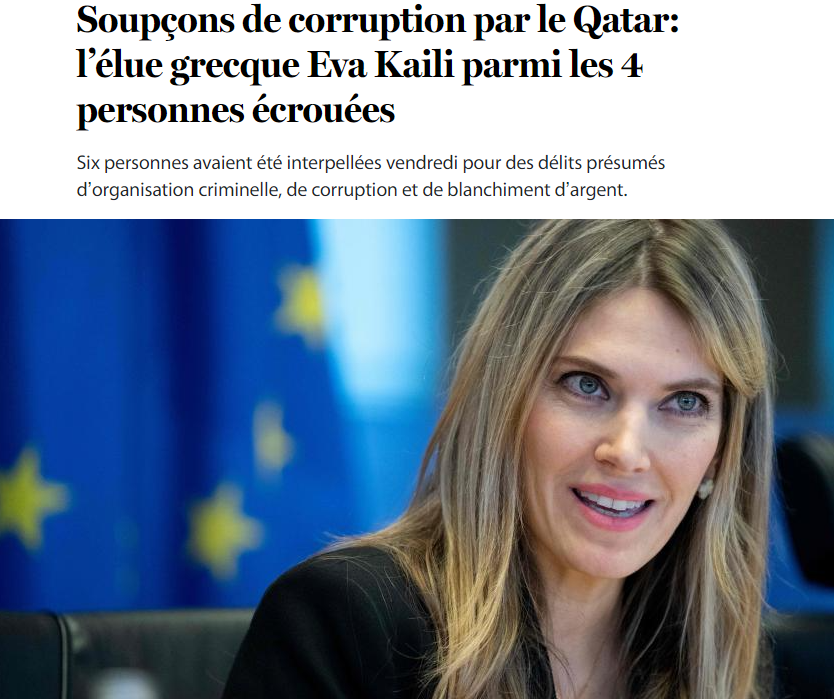 Σύμφωνα με τις εφημερίδες «L’ Echo» και «Le Soir» η Εύα Καϊλή βρίσκεται ανάμεσα στους τέσσερις συλληφθέντες και οι κατηγορίες που αντιμετωπίζει η Ελληνίδα ευρωβουλευτής όπως και οι υπόλοιποι συλληφθέντες είναι βαρύτατες και αφορούν σε συμμετοχή σε εγκληματική οργάνωση, ξέπλυμα χρήματος και διαφθορά.