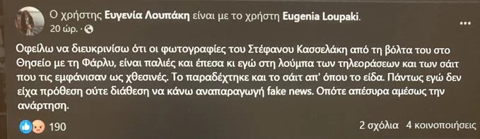 «Οφείλω να διευκρινίσω ότι οι φωτογραφίες του Στέφανου Κασσελάκη από τη βόλτα του στο Θησείο με τη Φάρλυ, είναι παλιές και έπεσα κι εγώ στη λούμπα των τηλεοράσεων και των σάιτ που τις εμφάνισαν ως χθεσινές. Το παραδέχτηκε και το σάιτ απ’όπου το είδα. Πάντως εγώ δεν είχα πρόθεση ούτε διάθεση να κάνω αναπαραγωγή fake news. Οπότε απέσυρα αμέσως την ανάρτηση», έγραψε.