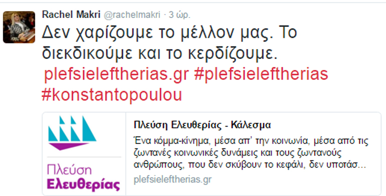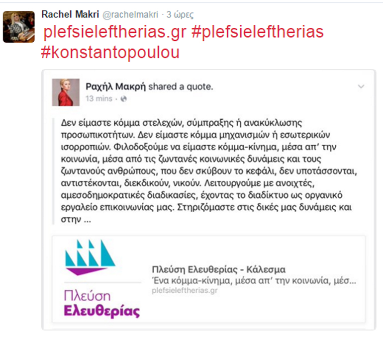 Τη συμμετοχή της στον νέο πολιτικό φορέα που θα ανακοινώσει την Τρίτη η Ζωή Κωνσταντοπούλου ανακοίνωσε η πρώην βουλευτής του ΣΥΡΙΖΑ και των ΑΝΕΛ Ραχήλ Μακρή.