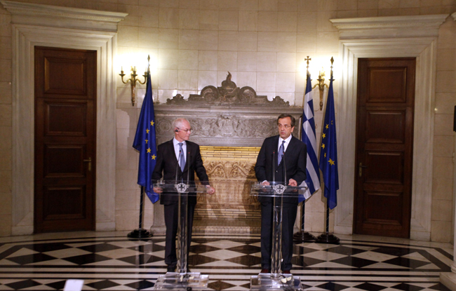 «Oι αντοχές των Ελλήνων έχουν φτάσει στα όρια τους», επεσήμανε μεταξύ άλλων, ο πρωθυπουργός κατά τις κοινές δηλώσεις των δύο ανδρών μετά το τέλος της συνάντησης. Ο κ. Σαμαράς ανέφερε ότι τόνισε στον κ. Ρομπάι το πρόβλημα της διόγκωσης της ύφεσης, αλλά και της έλλειψης ρευστότητας στην ελληνική αγορά. Μάλιστα, επεσήμανε πως είναι «αναγκαία η έγκαιρη αποδέσμευση της επόμενης δόσης, ώστε να αποκατασταθεί η ρευστότητα στο εσωτερικό». Παράλληλα, ευχαρίστησε τον πρόεδρο του Ευρωπαϊκού Συμβουλίου, που ήταν πάντα συγκρατημένος και μετρημένος στις δηλώσεις αναφορικά με τη χώρα μας.