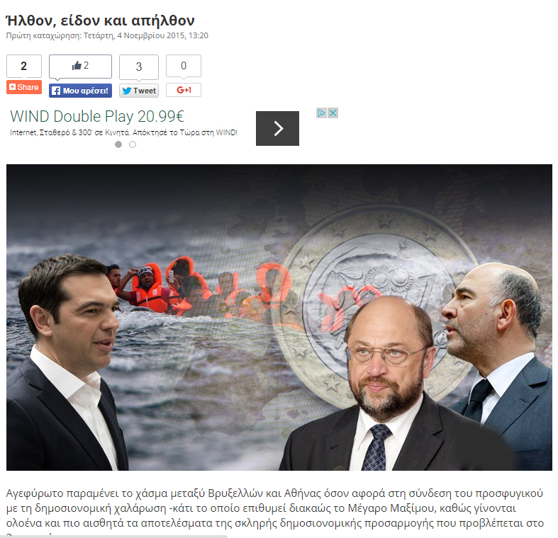 Το Μέγαρο Μαξίμου, πάντως, εμφανίζεται ικανοποιημένο από τις επαφές με Μοσκοβισί και Σουλτς, καθώς πρόκειται για δύο ισχυρούς Ευρωπαίους αξιωματούχους, με σημαντική επιρροή, αν και ο πρόεδρος του Ευρωκοινοβουλίου δεν έχει λόγο στο κουαρτέτο των πιστωτών.
