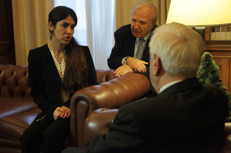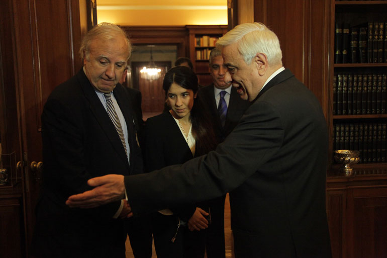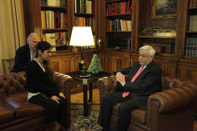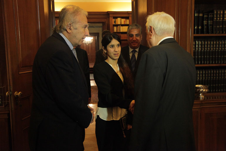 «Μέσα από τον προσωπικό σας εφιάλτη και τον προσωπικό σας Γολγοθά κατά την φρικτή γενοκτονία των Γεζίντι, έχετε αναδειχθεί -και αυτό να το ξέρετε- σε ένα σύγχρονο σύμβολο γενναίας υπεράσπισης της αξίας και της αξιοπρέπειας του ανθρώπου» υπογράμμισε από την πλευρά του ο Πρόεδρος της Δημοκρατίας, υπογραμμίζοντας: «Από εδώ, την Ελλάδα, που είναι κοιτίδα της Δημοκρατίας και του Πολιτισμού, στέλνουμε μαζί προς κάθε κατεύθυνση, και ιδίως προς την υπόλοιπη Ευρωπαϊκή Ένωση, το μήνυμα ότι στο επίκεντρο της σύγχρονης Δημοκρατίας και το σύγχρονου πολιτισμού είναι ο άνθρωπος, και αυτόν πρέπει να υπερασπισθούμε.