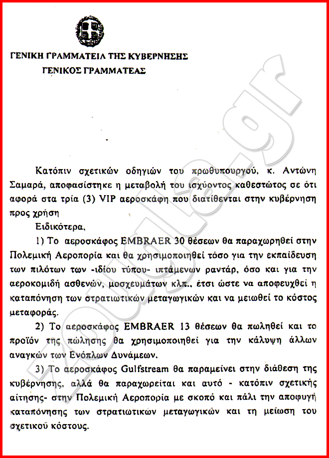 Τέλος, το αεροσκάφος Gulfstream θα παραμείνει στην διάθεση της κυβέρνησης, αλλά θα παραχωρείται και αυτό στην Πολεμική Αεροπορία.