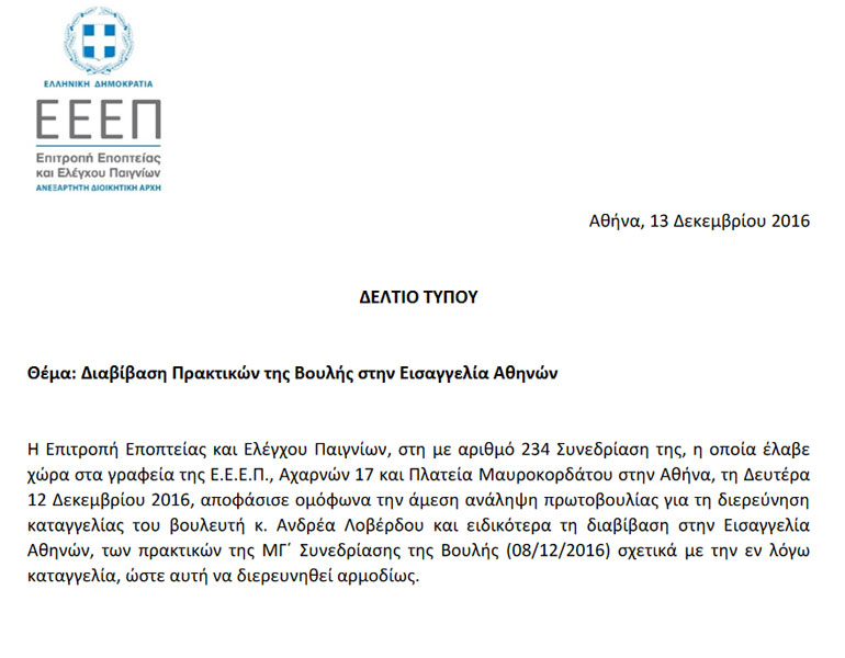 Όπως αναφέρει σε σχετική ανακοίνωση, η Επιτροπή Εποπτείας και Ελέγχου Παιγνίων, στη με αριθμό 234 Συνεδρίαση της, η οποία έλαβε χώρα στα γραφεία της Ε.Ε.Ε.Π., Αχαρνών 17 και Πλατεία Μαυροκορδάτου στην Αθήνα, τη Δευτέρα 12 Δεκεμβρίου 2016, αποφάσισε ομόφωνα την άμεση ανάληψη πρωτοβουλίας για τη διερεύνηση καταγγελίας του βουλευτή κ. Ανδρέα Λοβέρδου και ειδικότερα τη διαβίβαση στην Εισαγγελία Αθηνών των πρακτικών της ΜΓ΄ Συνεδρίασης της Βουλής (08/12/2016) σχετικά με την εν λόγω καταγγελία, ώστε αυτή να διερευνηθεί αρμοδίως.