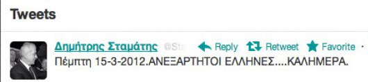 Με ένα… αινιγματικό αλλά ταυτοχρόνως και ευκόλως ερμηνευόμενο μήνυμα στο twitter, ο Δημήτρης Σταμάτης υπονόησε την προσχώρησή του στο νεοϊδρυθέν κόμμα του Πάνου Καμμένου, «Ανεξάρτητοι Έλληνες».