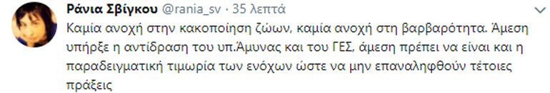 «Καμία ανοχή στην κακοποίηση ζώων, καμία ανοχή στη βαρβαρότητα. Άμεση υπήρξε η αντίδραση του υπουργού Άμυνας και του ΓΕΣ, άμεση πρέπει να είναι και η παραδειγματική τιμωρία των ενόχων ώστε να μην επαναληφθούν τέτοιες πράξεις» αναφέρει χαρακτηριστικά η κ. Σβίγκου.