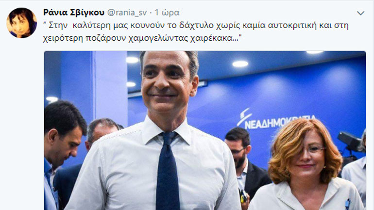 «Στην καλύτερη μας κουνούν το δάχτυλο χωρίς καμία αυτοκριτική και στη χειρότερη ποζάρουν χαμογελώντας χαιρέκακα…», έγραψε η εκπρόσωπος Τύπου του ΣΥΡΙΖΑ, Ράνια Σβίγκου, σε ανάρτησή της στο twitter, αναφερόμενη στον πρόεδρο της Νέας Δημοκρατίας Κυριάκο Μητσοτάκη και την εκπρόσωπο Τύπου του κόμματος Μαρία Σπυράκη.