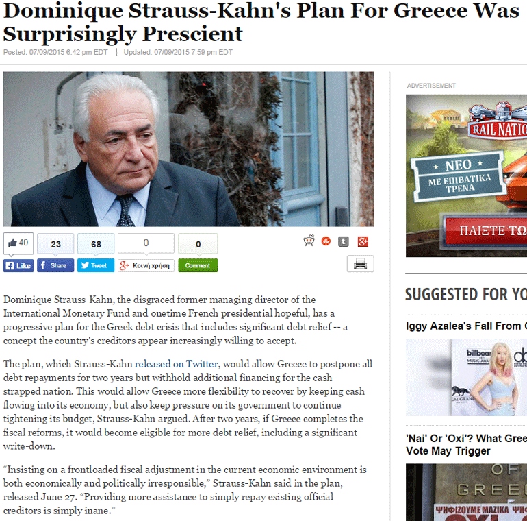 Ο πρώην γενικός διευθυντής του Διεθνούς Νομισματικού Ταμείου (ΔΝΤ), που (υποχρεώθηκε να αποχωρήσει ντροπιασμένος) υπέβαλε ένα προοδευτικό πρόγραμμα για την επίλυση της κρίσης του ελληνικού χρέους, στο οποίο περιλαμβάνει ουσιαστικές ελαφρύνσεις.