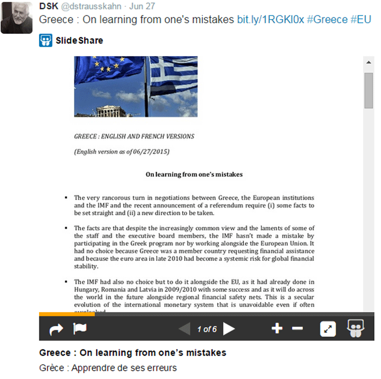 Ο Στρος-Καν στο σχέδιό του για την Ελλάδα, παραδέχεται ότι η προσέγγιση του ΔΝΤ επί της ηγεσίας του «έκανε κάποια λάθη και είμαι έτοιμος να αναλάβω το μερίδιο της ευθύνης που μου ανήκει», όπως έγραψε.