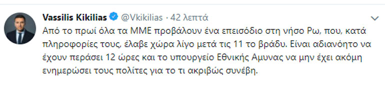 «Είναι αδιανόητο να έχουν περάσει 12 ώρες και το υπουργείο Εθνικής Άμυνας να μην έχει ακόμη ενημερώσει τους πολίτες για το τι ακριβώς συνέβη» τονίζει σε ανάρτησή του στο Τwitter ο τομεάρχης Άμυνας της ΝΔ Βασίλης Κικίλιας αναφορικά με το επεισόδιο στη νήσο Ρω.
