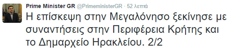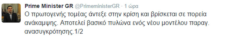 Το πρώτο σχόλιο του πρωθυπουργού Αλέξη Τσίπρα στο Τwitter για την επίσκεψή του στην Κρήτη αφορούσε στον πρωτογενή τομέα, ο οποίος, όπως επισημαίνει, «άντεξε στην κρίση και βρίσκεται σε πορεία ανάκαμψης. Αποτελεί βασικό πυλώνα ενός νέου μοντέλου παραγωγικής ανασυγκρότησης».