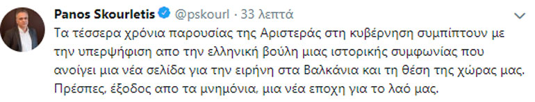«Τα τέσσερα χρόνια παρουσίας της Αριστεράς στην κυβέρνηση συμπίπτουν με την υπερψήφιση από την ελληνική Βουλή μιας ιστορικής συμφωνίας που ανοίγει μια νέα σελίδα για την ειρήνη στα Βαλκάνια και τη θέση της χώρας μας. Πρέσπες, έξοδος από τα μνημόνια, μια νέα εποχή για τον λαό μας», έγραψε ο γραμματέας της Κεντρικής Επιτροπής του ΣΥΡΙΖΑ, Πάνος Σκουρλέτης, σε ανάρτηση του στο Twitter.