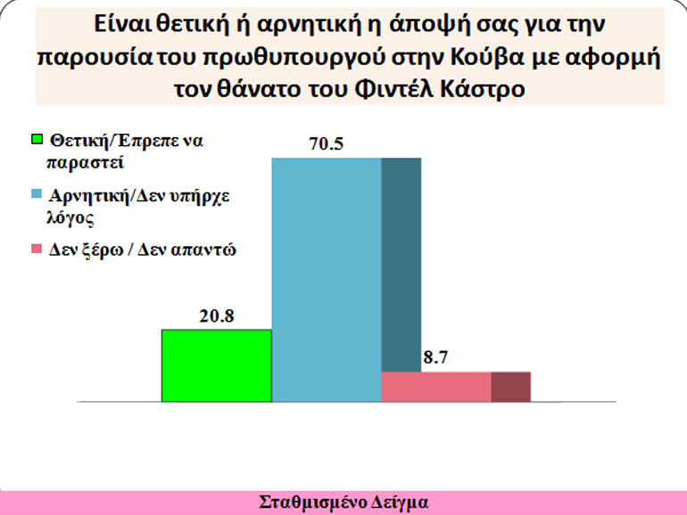 Πολλά ακούστηκαν και άλλα τόσα γράφτηκαν στον Τύπο για το πρόσφατο ταξίδι του πρωθυπουργού στην Κούβα. Ποια ήταν, όμως, η άποψη των πολιτών για την απόφαση του πρωθυπουργού να παραστεί στην κηδεία του Φιντέλ Κάστρο στην Κούβα; Οι περισσότεροι -σε ποσοστό 70,5%- πιστεύουν ότι δεν υπήρχε λόγος ο Αλέξης Τσίπρας να μεταβεί στην Αβάνα. Μόλις το 20,8% επικρότησε την ενέργεια του προέδρου του ΣΥΡΙΖΑ.