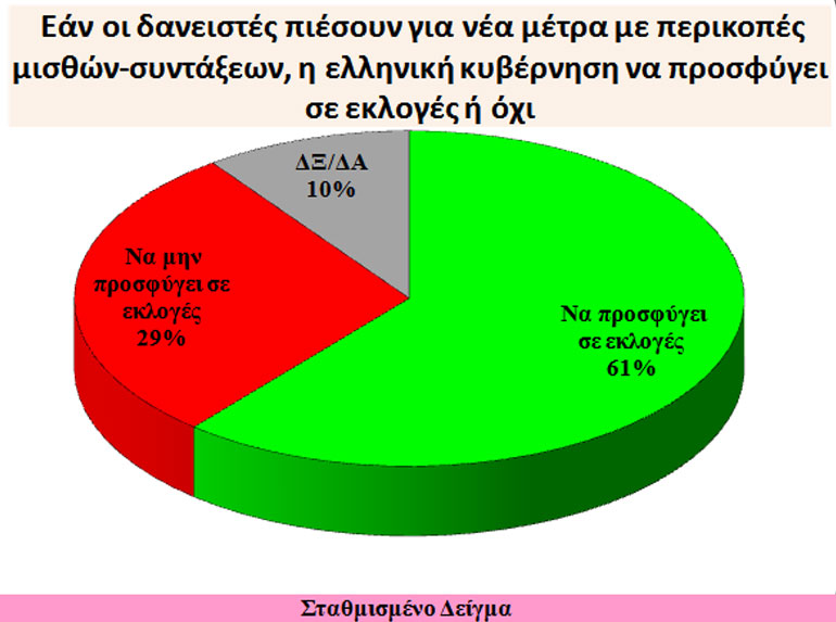 Οι συμμετέχοντες προέκριναν τη λύση των εκλογών, εάν οι θεσμοί ζητήσουν νέα μέτρα. Σε σύνολο 61% οι πολίτες επιθυμούν να στηθούν κάλπες και σε ποσοστό 29% θεωρούν ότι δεν θα έπρεπε η χώρα να οδηγηθεί σε πρόωρες εκλογές.