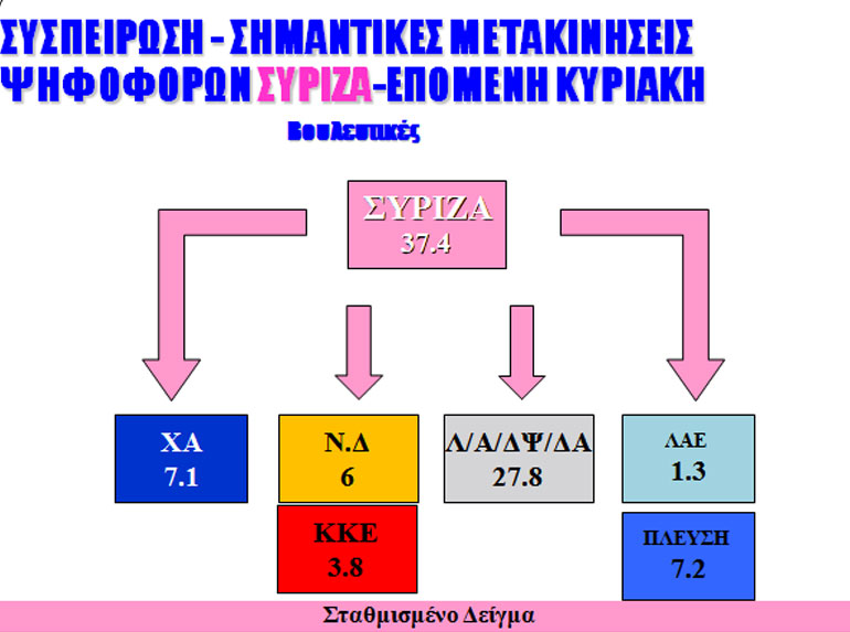 Η ΝΔ εμφανίζεται να προηγείται με διψήφια διαφορά έναντι του ΣΥΡΙΖΑ, σταθερή παραμένει η Χρυσή Αυγή, φθορά υφίστανται οι Ανεξάρτητοι Έλληνες -προφανώς λόγω της συμμετοχής τους στον κυβερνητικό συνασπισμό- ενώ εντυπωσιακή είναι η άνοδος της «Πλεύσης Ελευθερίας». Στον αντίποδα, Ένωση Κεντρώων και «Ποτάμι» έχουν απολέσει πολλές μονάδες και κινούνται εκτός Βουλής. ΠΑΣΟΚ και ΚΚΕ διατηρούν τα εκλογικά τους ποσοστά περίπου στα ίδια επίπεδα με τις εκλογές του Σεπτεμβρίου 2015.