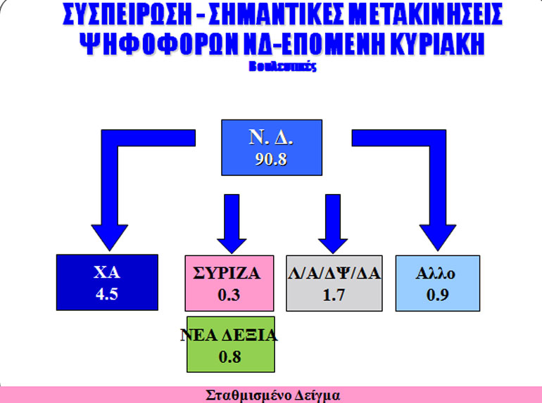Υψηλά ποσοστά συσπείρωσης εμφανίζει η ΝΔ, κόμμα σε αναμονή εξουσίας, με αρκετούς ψηφοφόρους της πάντως να κατευθύνονται προς τη Χρυσή Αυγή.