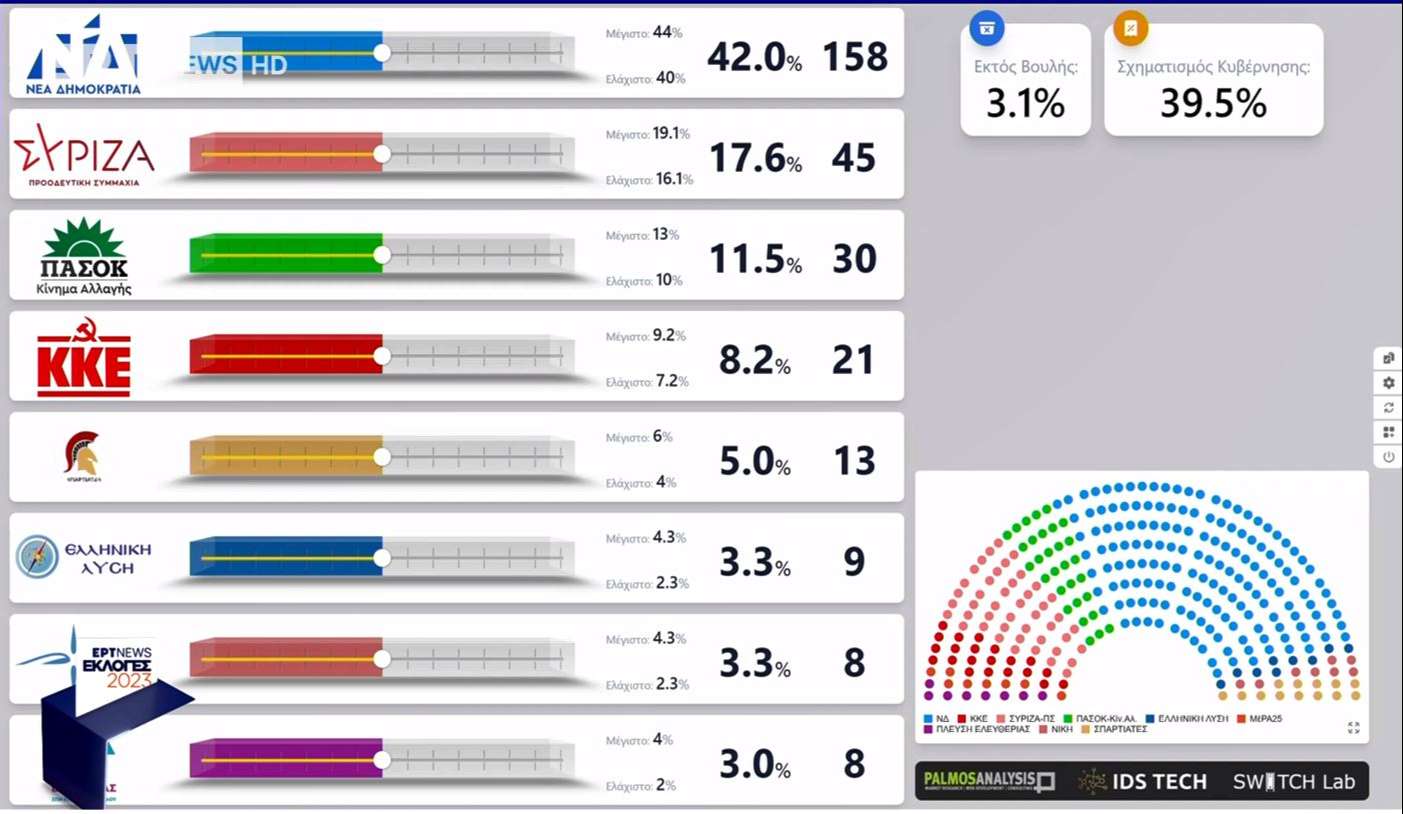 Το τελικό exit poll, που ετοίμασαν από κοινού οι μεγάλες εταιρείες δημοσκοπήσεων συγκεντρώνοντας στοιχεία από τα εκλογικά κέντρα, διαμορφώνεται ως εξής: