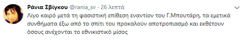 «Λίγο καιρό μετά τη φασιστική επίθεση εναντίον του Γ.Μπουτάρη, τα εμετικά συνθήματα έξω από το σπίτι του προκαλούν αποτροπιασμό και εκθέτουν όσους ανέχονται το εθνικιστικό μίσος», τονίζει η εκπρόσωπος Τύπου του ΣΥΡΙΖΑ, Ράνια Σβίγκου, με ανάρτηση στον προσωπικό λογαριασμό της στο Twitter.