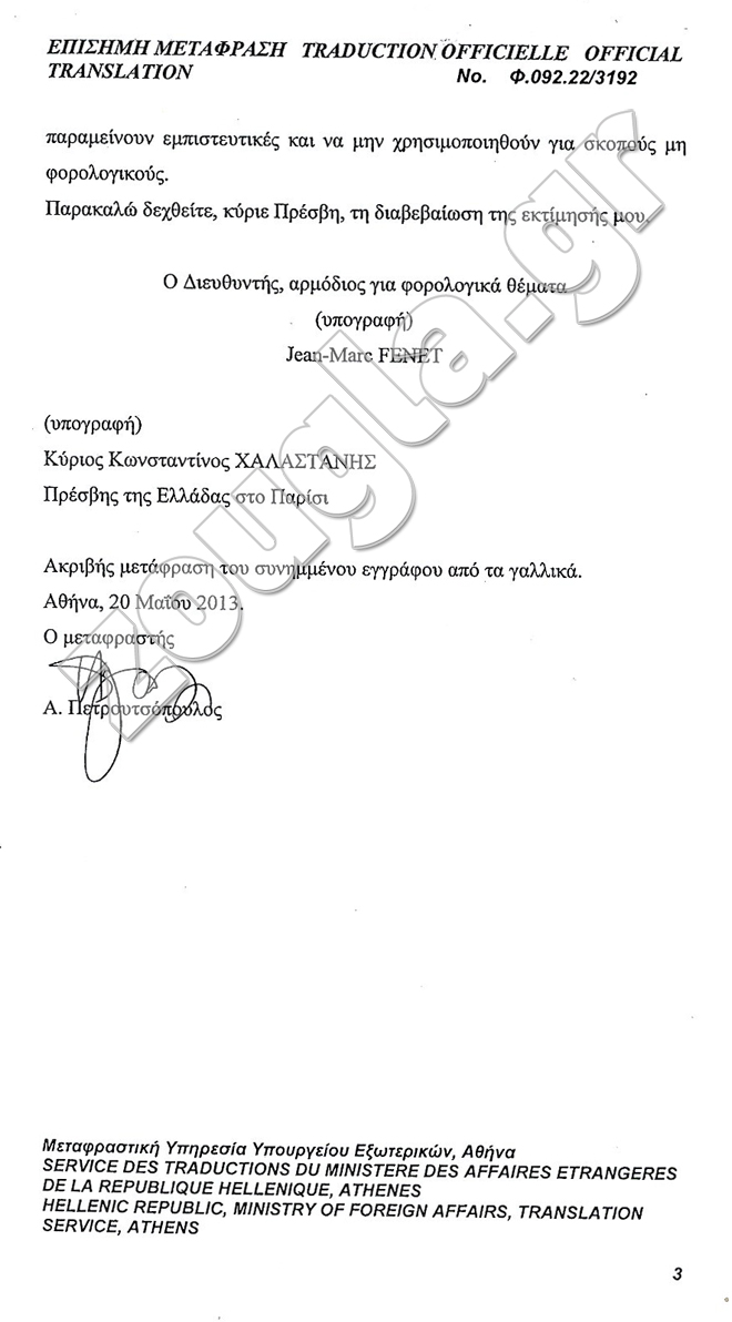 Όπως άλλωστε προκύπτει και από έγγραφο που εστάλη στις 29 Σεπτεμβρίου 2010 από τη γαλλική γενική διεύθυνση δημοσίων οικονομικών προς τον τότε Έλληνα πρέσβη Κωνσταντίνο Χαλαστάνη, «οι πληροφορίες διαβιβάστηκαν σύμφωνα με το άρθρο 23 της από 21 Αυγούστου 1963 φορολογικής σύμβασης μεταξύ Γαλλίας και Ελλάδας».