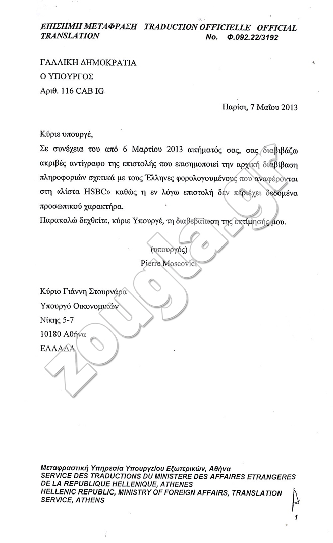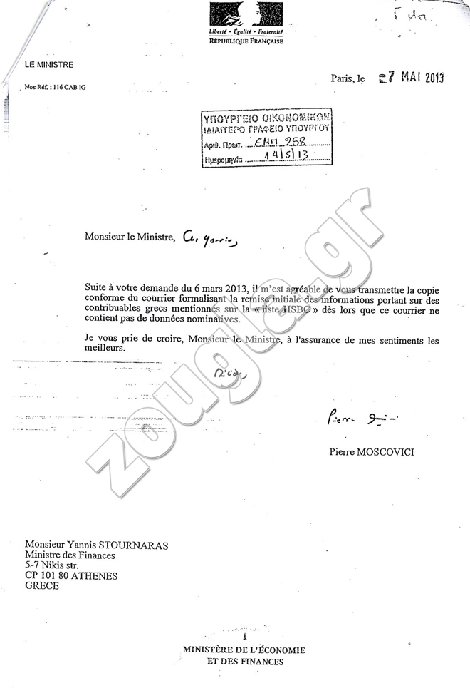 Τα έγγραφα που διαβιβάστηκαν στην Προανακριτική Επιτροπή της Βουλής που διερευνά την υπόθεση, είχαν αποσταλεί στις 7 Μαΐου 2013 στον κ. Στουρνάρα από τον Γάλλο υπουργό Οικονομικών, Πιέρ Μοσχοβισί και αναφέρουν ότι οι Γάλλοι είχαν αποστείλει επίσημα στον κ. Παπακωνσταντίνου το cd με βάση τη φορολογική σύμβαση των δύο χωρών για ανταλλαγή πληροφοριών και όχι «άτυπα» και «υπογείως» μέσω κρατικών μυστικών υπηρεσιών.