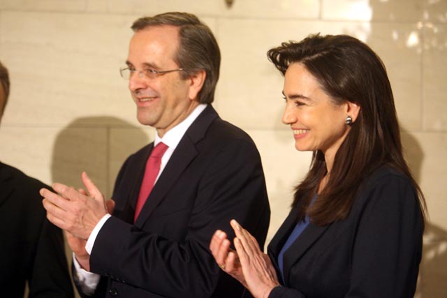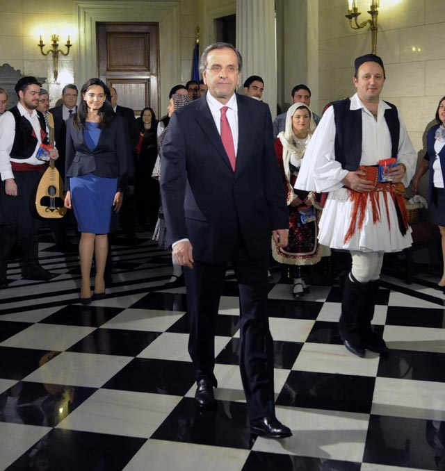 Τα κάλαντα από τους βρακοφόρους της Κρήτης άκουσαν ο πρωθυπουργός Αντώνης Σαμαράς και η σύζυγός του Γεωργία στο Μέγαρο Μαξίμου.