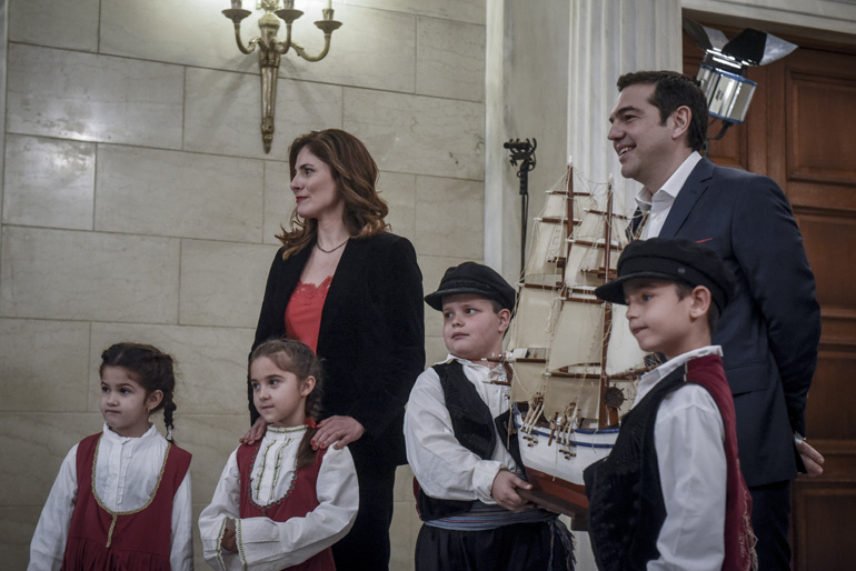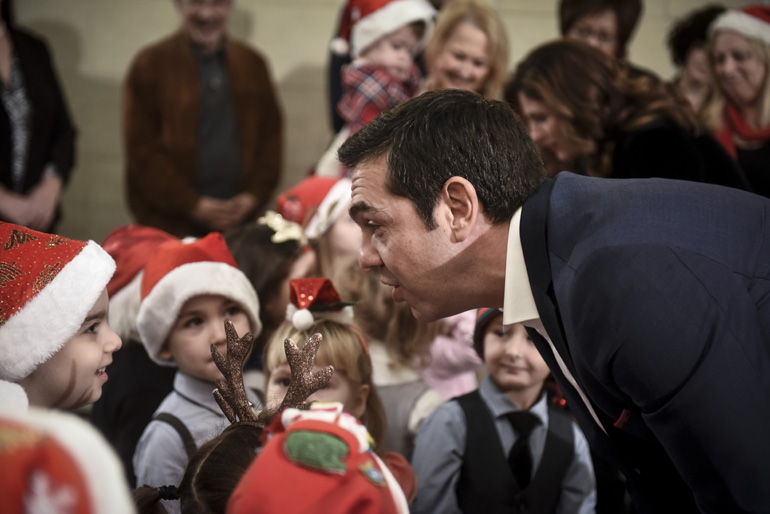 Ο πρωθυπουργός Αλέξης Τσίπρας και η σύντροφός του Περιστέρα Μπαζιάνα υποδέχθηκαν τα παιδιά του Πρότυπου Εθνικού Νηπιοτροφείου και άκουσαν τα κάλαντα της Πρωτοχρονιάς και παιδικά χριστουγεννιάτικα τραγούδια, για να φωτογραφηθούν εν συνέχεια όλοι μαζί μπροστά από το χριστουγεννιάτικο δέντρο που κοσμεί το Μέγαρο Μαξίμου.