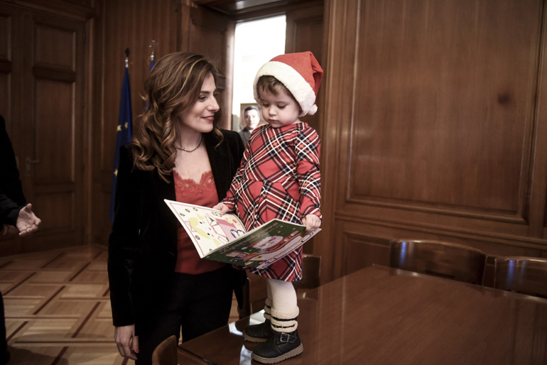 Ο κ. Τσίπρας χαιρέτισε ένα- ένα τα μικρά παιδιά, ανταλλάσσοντας ευχές, με τον πρωθυπουργό να «ενημερώνεται» από το καθένα για το τι δώρο έχουν ζητήσει να βρουν κάτω απ’ το δέντρο το ξημέρωμα της Πρωτοχρονιάς. Ο κ. Τσίπρας τους μοίρασε παιδικά βιβλία, τα οποία στη συνέχεια τα παιδιά θα τα ξεφύλλιζαν με την κ. Μπαζιάνα, στο γραφείο του Πρωθυπουργού, το οποίο είχε γεμίσει με τους μικρούς επισκέπτες, ενώ ο κ. Τσίπρας είχε συζήτηση με τους δασκάλους των παιδιών.