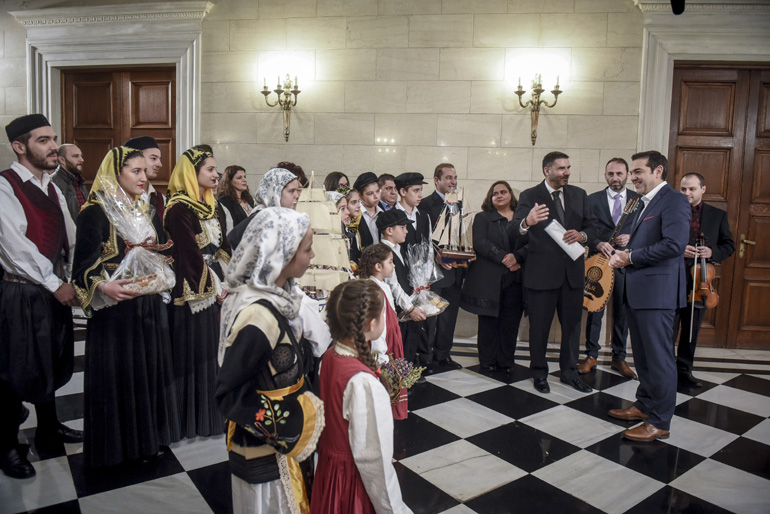 Στη συνέχεια τα πρωτοχρονιάτικα κάλαντα τραγούδησαν στον πρωθυπουργό και τη σύντροφό του κ. Μπαζιάνα ο Πολιτιστικός Σύλλογος Ερέτριας «Κωνσταντής Κανάρης» και ο Πολιτιστικός Σύλλογος Λούτσας «Η Δέλφη», με τα συγκροτήματα να παίζουν και να χορεύουν και παραδοσιακούς νησιώτικους χορούς. Ιδιαίτερο χρώμα έδωσαν με τον χορό τους τα μικρά παιδιά των συλλόγων.