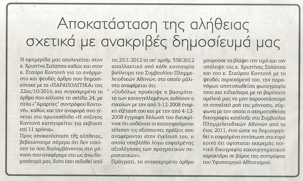 Η εφημερίδα αναγνωρίζει πως προέβη σε ψευδές δημοσίευμα με ψευδή στοιχεία και αποκαθιστά την αξιοπρέπεια και τιμή του υπουργού Δικαιοσύνης λέγοντας χαρακτηριστικά «Η εφημερίδα μας απολογείται στην κ. Χριστίνα Σαλάππα καθώς και στον κ. Σταύρο Κοντονή για το ανάρμοστο και ψευδές άρθρο που δημοσιεύθηκε στα Παραπολιτικά της 22ας/10/2016…».