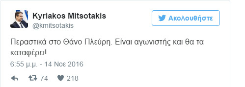 «Περαστικά στο Θάνο Πλεύρη. Είναι αγωνιστής και θα τα καταφέρει!» έγραψε στο Twitter ο κ. Κυριάκος Μητσοτάκης.