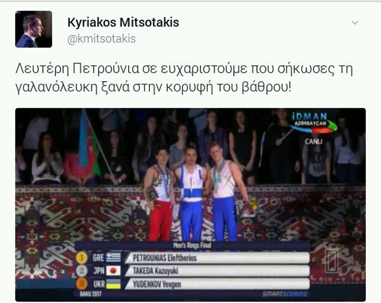 Τα προσωπικά του συγχαρητήρια έδωσε ο Πρόεδρος της Νέας Δημοκρατίας, Κυριάκος Μητσοτάκης στους δύο Έλληνες αθλητές, Λευτέρη Πετρούνια και Βασιλική Μιλλούση που οι εξαιρετικές επιδόσεις τους στο Παγκόσμιο Κύπελλο ενόργανης «AGF Trophy 2017» το οποίο διεξάγεται στο Μπακού, ανέβασαν την Ελλάδα, στα ψηλότερα σκαλιά του βάθρου.
