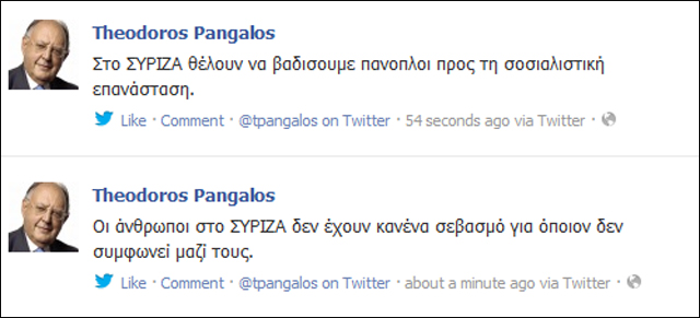 O Θεόδωρος Πάγκαλος άσκησε κριτική μέσω του Twitter στην πολιτική που προσπαθεί να εφαρμόσει ο ΣΥΡΙΖΑ μετά τις βουλευτικές εκλογές της 17ης Ιουνίου.