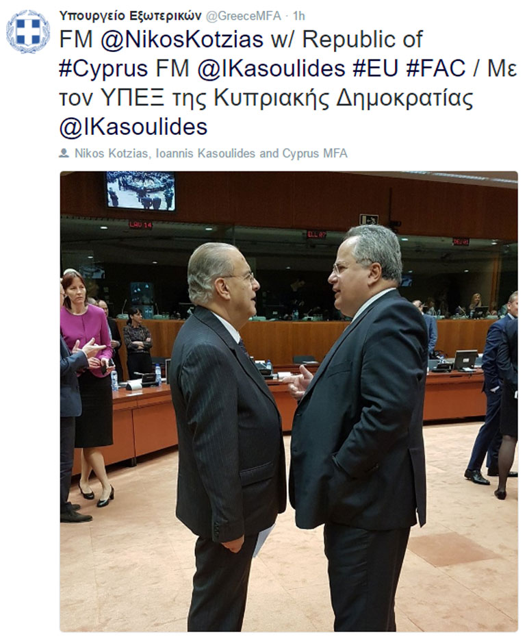 Σύμφωνα με ανάρτηση του Υπουργείου Εξωτερικών, οι ΥΠΕΞ Ελλάδος και Κύπρου συνομίλησαν για μερικά λεπτά στο πλαίσιο του Συμβουλίου, καθώς υπάρχουν ανοικτά αρκετά ζητήματα στα οποία χρειάζεται συντονισμός κινήσεων και ανταλλαγή απόψεων μεταξύ των δύο χωρών.