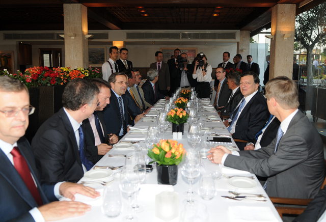 To βράδυ, οι κ.κ. Σαμαράς και Μπαρόζο συμμετείχαν σε ευρεία συνάντηση με μέλη της κυβέρνησης (Στουρνάρας, Σταϊκούρας) στη Μεγάλη Βρετάνια. Στη σύναντηση ήταν παρόντες ο εκπρόσωπος της τρόικας, Ματίας Μόρς και ο επικεφαλής της Ομάδας Δράσης Χορστ Ράιχενμπαχ.