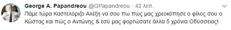 Ο πρώην πρωθυπουργός Γιώργος Παπανδρέου μέσω Τwitter απάντησε στον Αλέξη Τσίπρα: «Πάμε τώρα Καστελόριζο Αλέξη να σου πω πώς μας χρεοκόπησε ο φίλος σου ο Κώστας και πώς ο Αντώνης & εσύ μας φορτώσατε άλλα 5 χρόνια Οδύσσειας!».