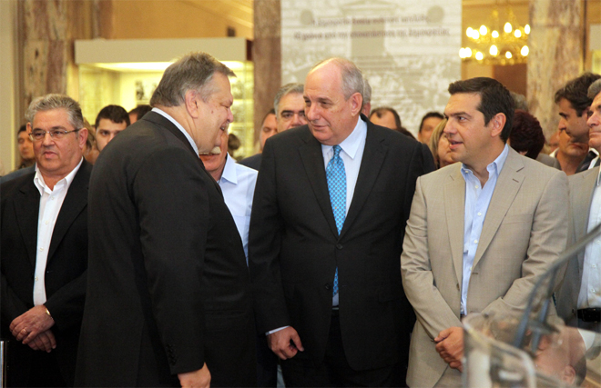 Μία σύντομη αλλά θερμή χειραψία είχαν οι Βενιζέλος και Τσίπρας στην εκδήλωση για τα 40 χρόνια αποκατάστασης της Δημοκρατίας.