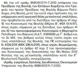 «Με την υπ’ αριθμ. 8581/6107/11-7-2012 απόφαση του Προέδρου της Βουλής των Ελλήνων διορίζεται στο Γραφείο του πρώην Προέδρου της Βουλής Βύρωνα Πολύδωρα, στη Βουλή, μετά την κατά νόμο πρόταση του, σε υπάρχουσα κενή οργανική θέση μετακλητού υπαλλήλου, που προβλέπεται από τις διατάξεις του άρθρου 41 παρ. 1Ε του Κανονισμού της Βουλής (Μέρος Β΄, ΦΕΚ 51/Α/97), όπως ισχύει, σύμφωνα με τις διατάξεις των άρθρων 41 και 42 του προαναφερόμενου Κανονισμού, η Μαργαρίτα Πολύδωρα του Βύρωνα (Α.Δ.Τ. Χ565658) με Γ’ βαθμό και το 2ο Μ.Κ. του βαθμού αυτού, όπως τούτο ισχύει για τους υπαλλήλους της Βουλής, της ΠΕ κατηγορίας του Ν. 4024/2011 (ΦΕΚ 226/Α/2011), όπως ισχύει, θεωρούμενης, σύμφωνα με το άρθρο 42 παρ. 2 του προαναφερόμενου Κανονισμού, της διακοπείσης την 18η Μαΐου 2012 θητείας της ως μετακλητής υπαλλήλου κατά την ΙΓ΄Βουλευτική Περίοδο, συνεχιζόμενης. (Αριθμ. εγκρίσεως δαπάνης Διευθύνσεως Οικονομικών Υπηρεσιών της Βουλής 8586/6112/11−7−2012)» αναφέρεται στην απόφαση.