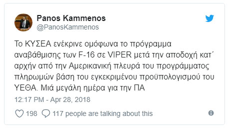 Όπως τονίζουν στο Πεντάγωνο, η αναβάθμιση των 85 F-16 σε Viper, όταν ολοκληρωθεί, αναμένεται να «απογειώσει» το αξιόμαχο των Ενόπλων Δυνάμεων και να ενισχύσει την αποτρεπτική ικανότητα της χώρας, σε μια κρίσιμη περίοδο εντάσεων με την Τουρκία.