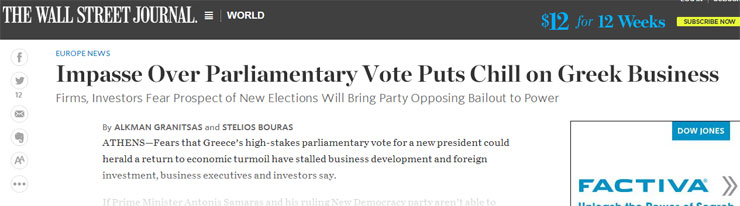 «Ο ΣΥΡΙΖΑ θέλει να ακυρώσει το πακέτο διάσωσης της τρόικας. Η προοπτική μιας νίκης του προκαλεί ανατριχίλα στους επιχειρηματίες» τονίζει το άρθρο της «WSJ», το οποίο αναφέρεται μεταξύ άλλων στην προεδρική εκλογή και την προσπάθεια του πρωθυπουργού Αντώνη Σαμαρά να βρει τους 180 βουλευτές που θα στηρίξουν την υποψηφιότητα Δήμα.