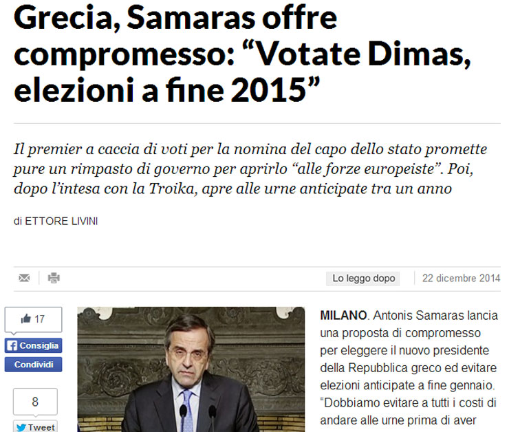 «Ελλάδα, ο Σαμαράς προσφέρει συμβιβασμό: ψηφίστε τον Δήμα, εκλογές στο τέλος του 2015» τιτλοφορεί το άρθρο της η «La Repubblica» και ο απεσταλμένος της εφημερίδας Έττορε Λιβίνι σημειώνει ότι «αύριο, το ελληνικό Κοινοβούλιο -το οποίο έχει κλονισθεί από κατηγορίες νοθείας και αγοραπωλησίας ψήφων των τελευταίων ημερών- θα συνεδριάσει για τη δεύτερη ψηφοφορία στο πλαίσιο της προβλεπόμενης διαδικασίας για την εκλογή νέου Προέδρου».