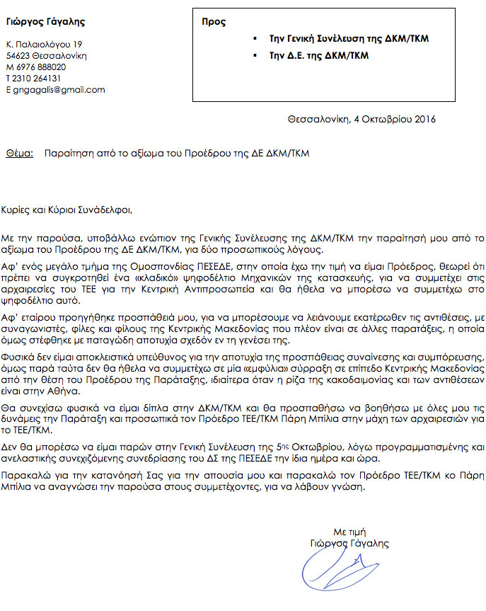 Επικαλείται στην επιστολή του, δύο προσωπικούς λόγους: «Αφ΄ ενός μεγάλο τμήμα της Ομοσπονδίας ΠΕΣΕΔΕ, στην οποία έχω την τιμή να είμαι Πρόεδρος, θεωρεί ότι πρέπει να συγκροτηθεί ένα «κλαδικό» ψηφοδέλτιο μηχανικών της κατασκευής για να συμμετέχει στις αρχαιρεσίες του ΤΕΕ για την Κεντρική Αντιπροσωπεία και θα ήθελα να συμμετάσχω στο ψηφοδέλτιο αυτό. Αφ’ εταίρου προηγήθηκε προσπάθεια μου, για να μπορέσουμε να λειάνουμε εκατέρωθεν τις αντιπαραθέσεις, με συναγωνιστές, φίλες και φίλους της Κεντρικής Μακεδονίας που πλέον είναι σε άλλες παρατάξεις, η οποία όμως στέφθηκε με παταγώδη αποτυχία σχεδόν εν τη γενέσει της».