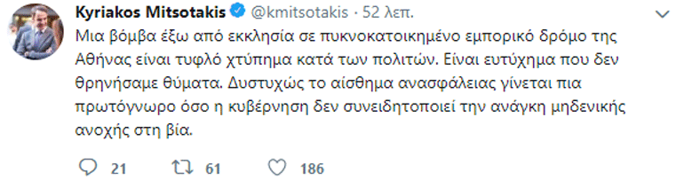 Ο πρόεδρος της ΝΔ τονίζει πως «μια βόμβα έξω από εκκλησία σε πυκνοκατοικημένο εμπορικό δρόμο της Αθήνας είναι τυφλό χτύπημα κατά των πολιτών» προσθέτοντας πως «είναι ευτύχημα που δεν θρηνήσαμε θύματα. Δυστυχώς το αίσθημα ανασφάλειας γίνεται πια πρωτόγνωρο όσο η κυβέρνηση δεν συνειδητοποιεί την ανάγκη μηδενικής ανοχής στη βία», καταλήγει στην ανάρτησή του ο Κυριάκος Μητσοτάκης.