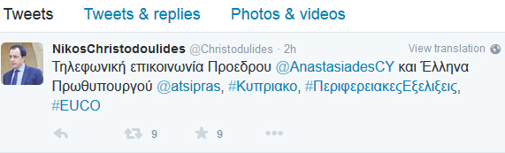 Σύμφωνα με ανάρτηση του Κύπριου κυβερνητικού εκπροσώπου Νίκου Χριστοδουλίδη στο Twitter, κατά τη συνομιλία Αναστασιάδη – Τσίπρα συζητήθηκαν το Κυπριακό, οι περιφερειακές εξελίξεις και η επερχόμενη σύνοδος του Ευρωπαϊκού Συμβουλίου.
