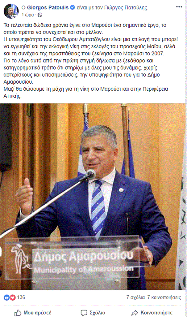 Την υποψηφιότητα του Θόδωρου Αμπατζόγλου στο δήμο Αμαρουσίου στηρίζει ο Γιώργος Πατούλης, δήμαρχος Αμαρουσίου και υποψήφιος Περιφερειάρχης Αττικής. Η δήλωση του κ. Πατούλη έγινε μετά την ανακοίνωση της συζύγου του, Μαρίνας Πατούλη-Σταυράκη, η οποία ανακοίνωσε και αυτή την υποψηφιότητά της για το δήμο Αμαρουσίου.