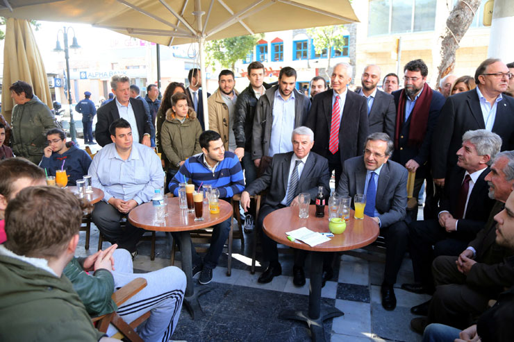 Στη συνέχεια, ο κ. Σαμαράς έκανε μία βόλτα στην πλατεία και στα μαγαζιά της πόλης, χαιρέτησε αρκετούς πολίτες και σε ένα καφέ συνομίλησε με νέους για τα προβλήματά τους.