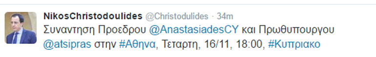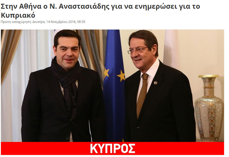 Την Τετάρτη, στις 18.00, θα πραγματοποιηθεί η συνάντηση του προέδρου της Κύπρου Νίκου Αναστασιάδη με τον Έλληνα πρωθυπουργό Αλέξη Τσίπρα στην Αθήνα, όπως ανακοίνωσε μέσω Twitter ο Κύπριος κυβερνητικός εκπρόσωπος Νίκος Χριστοδουλίδης.