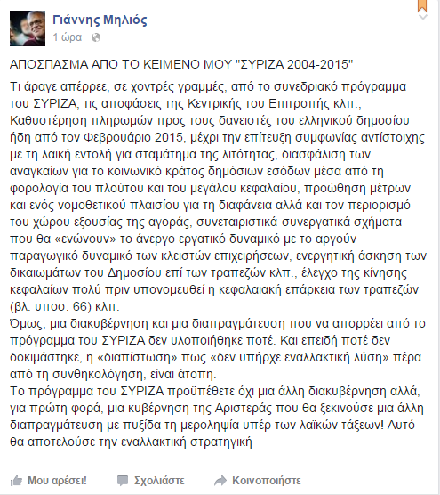 «Είναι επομένως άτοπη η διαπίστωση ότι δεν υπήρχε εναλλακτική πέρα από τη συνθηκολόγηση», είχε γράψει στο facebook τον περασμένο Ιανουάριο ο κ. Μηλιός.